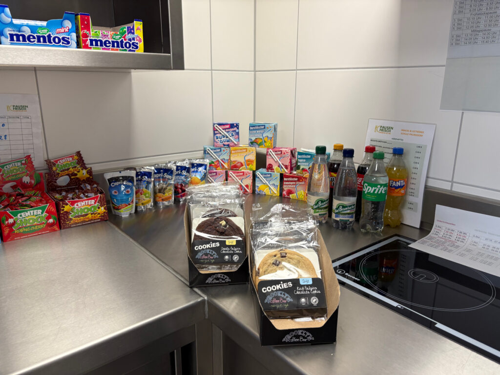 Zusätzlich bietet unsere Cafeteria täglich in den beiden Hofpausen ein kleines Angebot an Speisen und Getränken an. Von Schnitzelbrötchen und Cookie über Schokoriegel und Gummibärchen bis hin zu Erfrischungsgetränken ist für den kleinen Hunger und Durst zwischendurch gut gesorgt.
